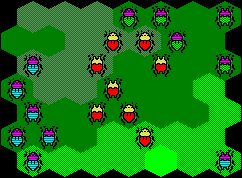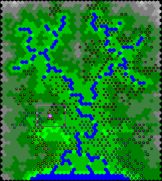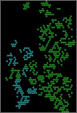 図は第 500,000 世代で,担当世代数の 1/3 でこれに到達しました.企画全体が 1,000,000 世代とするとちょうど半分です.同定してみると 2 種が存在しています.東の種が西側に進入して西の種を分断しているなかなかの緊張状態です.