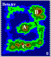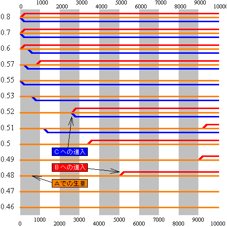 図のように通過地域Xを隔てて3ヶ所の生息地,A, B, Cが形成されうる状況で,Aのみに初期個体群を配置し,Xの生存率をさまざま(0.46〜0.80)に変化させました.その結果10,000世代までにBやCの生息地に定着できるかどうかを観察しました.
