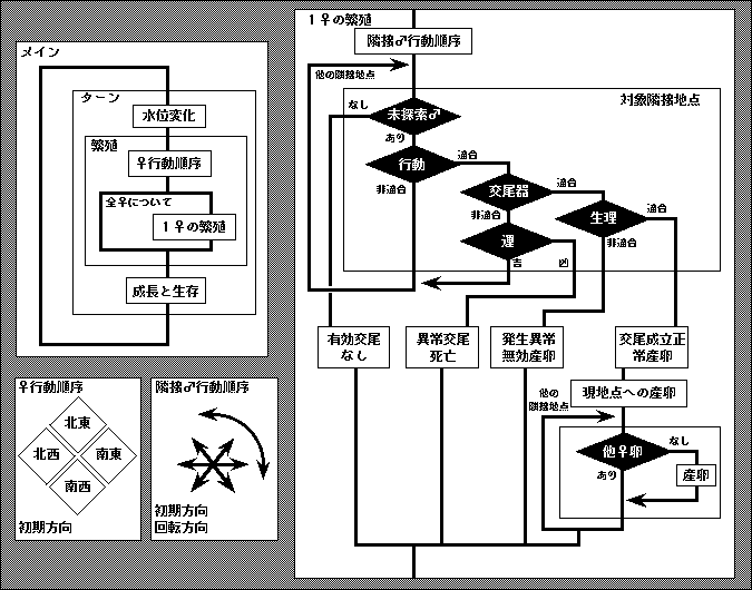 この人工生命に特徴的な事の第一は,交雑に関与する3形質の状態により,各段階の隔離機構が働く事である.生殖的隔離機構の段階の区分については各種 [2] の意見があり,細かく区分して 12 の段階が区別できる.こうちの主要な部分をを3つの隔離機構(行動的,形態的,配偶子的)に集約し,システムに組み込んだ.すなわち,1) 配偶行動形質が大きく相違すれば(つまりある許容差異よりも大きな差があれば)配偶相手として認識されず,2) 交尾器形態が大きく相違すれば正常な交尾が行われず死亡する危険が生じる.これらをクリアした上で 3) 生理的形質の差により配偶子的隔離が機能した場合,発生できない無効な卵を産むことになる.