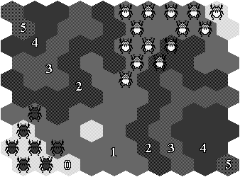 産下された正常卵が成虫まで生存する可能性は,地点ごとにあらかじめ決めた生存率に従うものとする.生存率の平面的な分布をマップとして与えることにより各種の分布障壁を設定,解除する.各地点が6つの隣接地点をもつ(ヘックス形式).